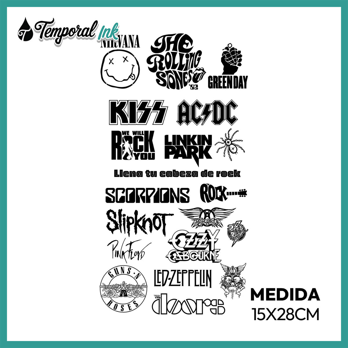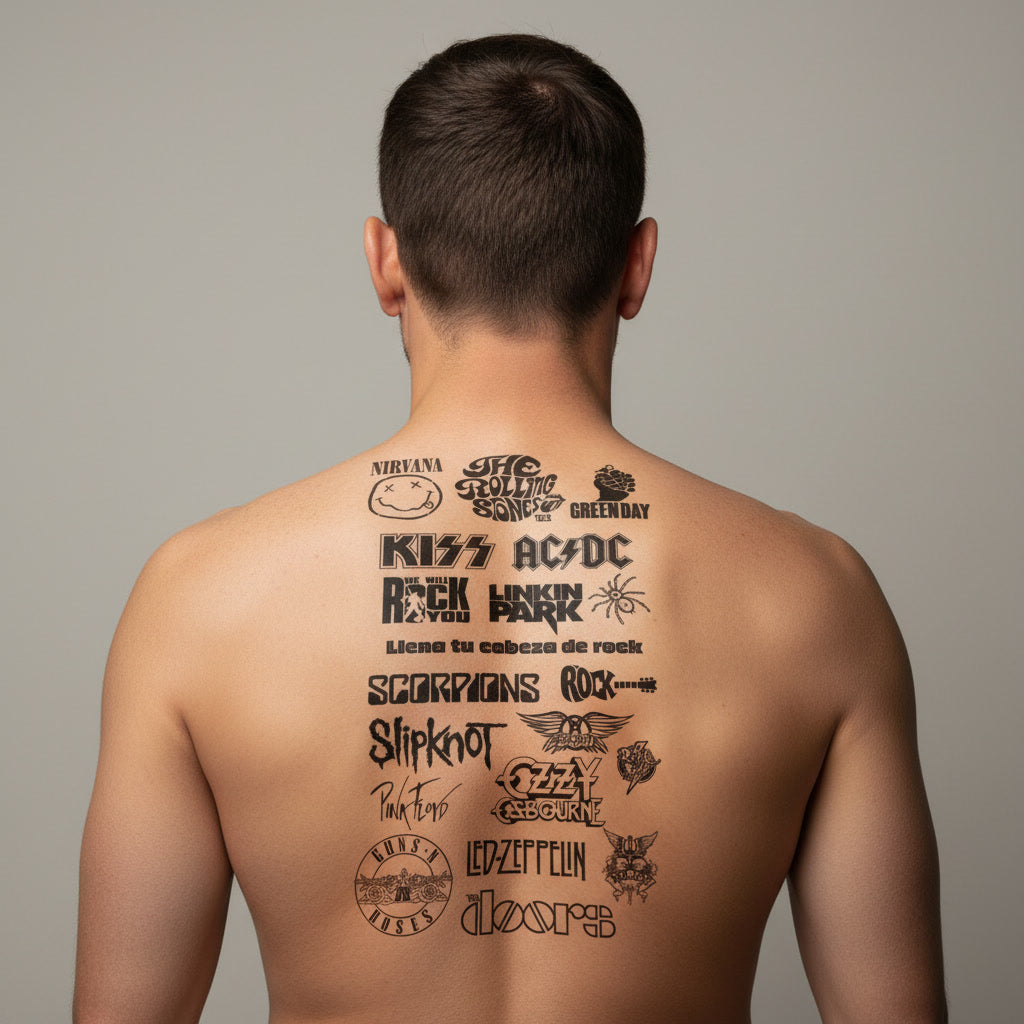 Este tatuaje temporal reúne logotipos y símbolos inspirados en bandas icónicas del rock en composición tipográfica fuerte.