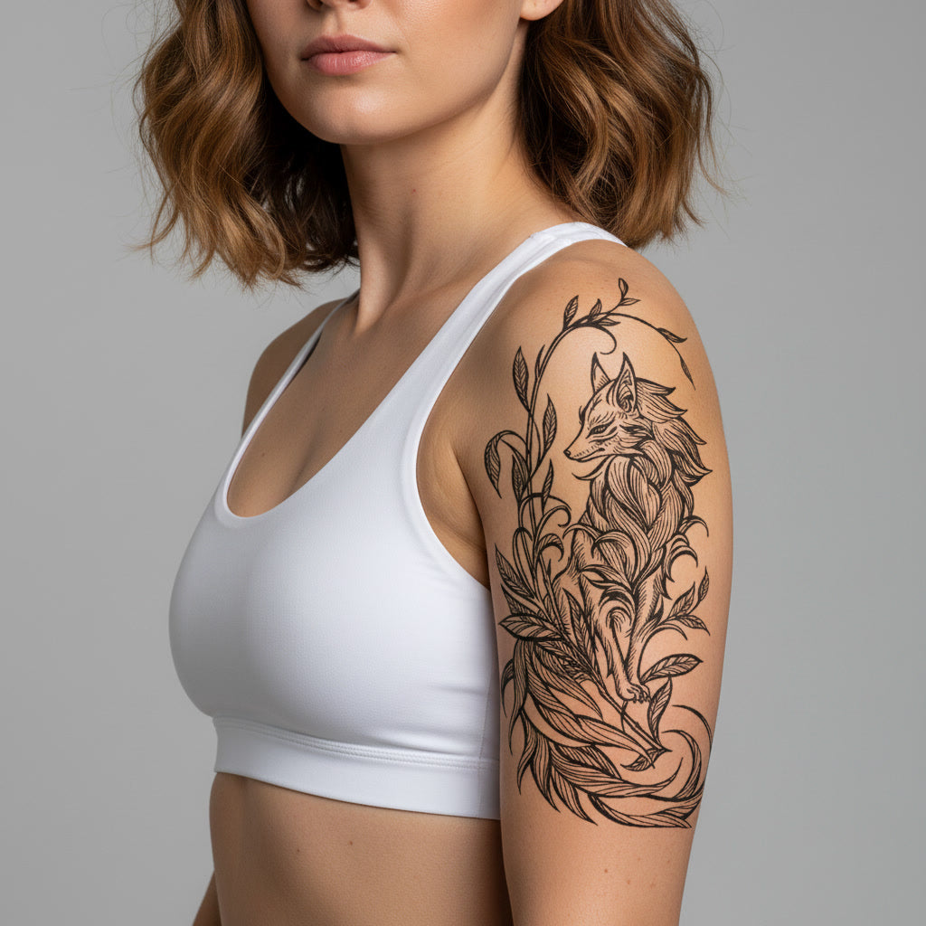Este tatuaje temporal presenta zorro estilizado rodeado de hojas y ramas en composición vertical delicada.