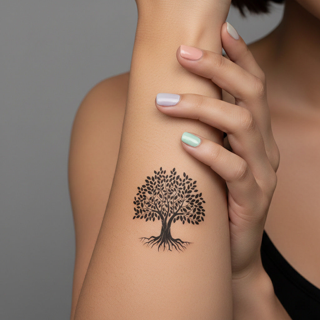 Tatuaje temporal con diseño detallado de árbol con raíces visibles, símbolo de fuerza y conexión.