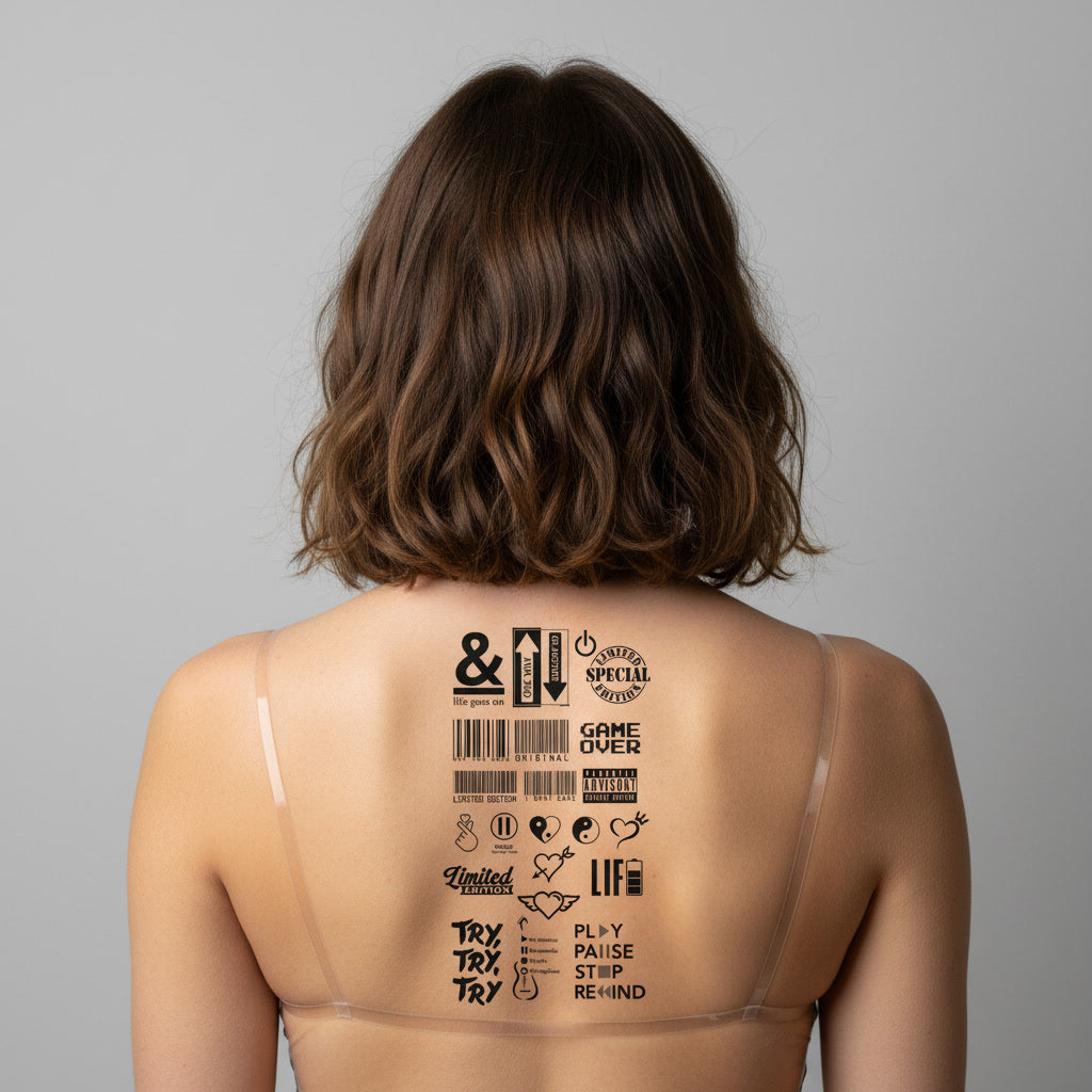Este tatuaje temporal reúne números angelicales, corazones, serpientes, ojos y símbolos alternativos en diseño juvenil.