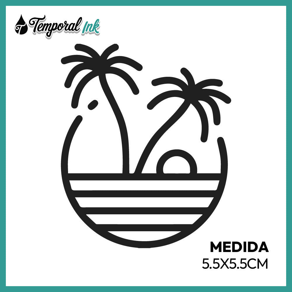 Tatuaje temporal pequeño de palmeras e isla. Relajado, simbólico y veraniego.