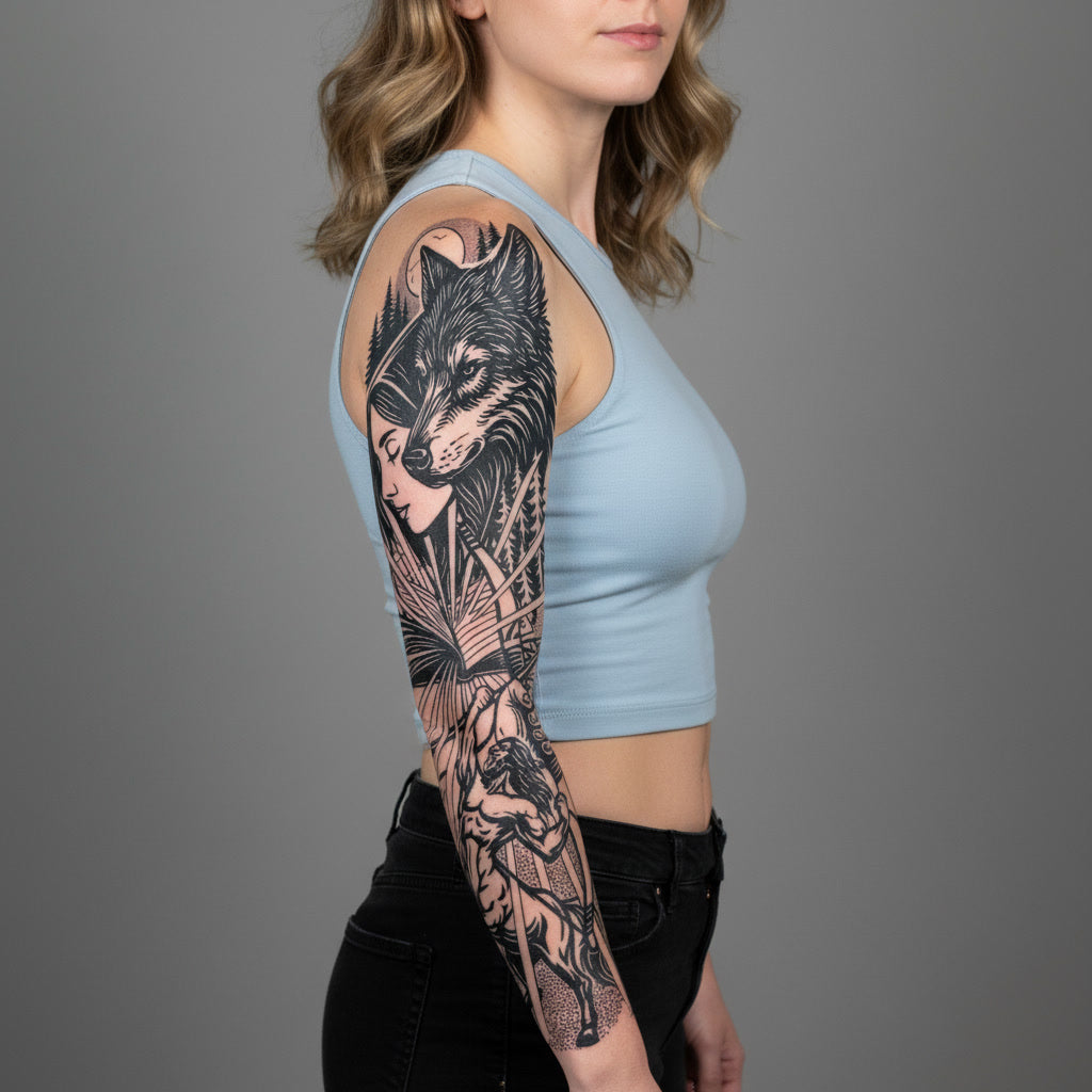 Diseño vertical con mujer y lobo fusionados en un entorno natural. Representa instinto, fuerza interior y conexión salvaje.