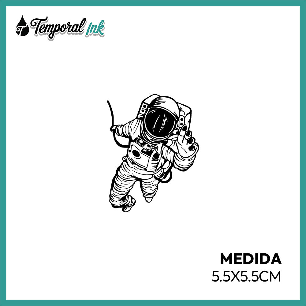 Tatuaje temporal de astronauta en estilo ilustración detallada. Representa aventura, exploración y libertad. Ideal para quienes aman el espacio y los diseños creativos.