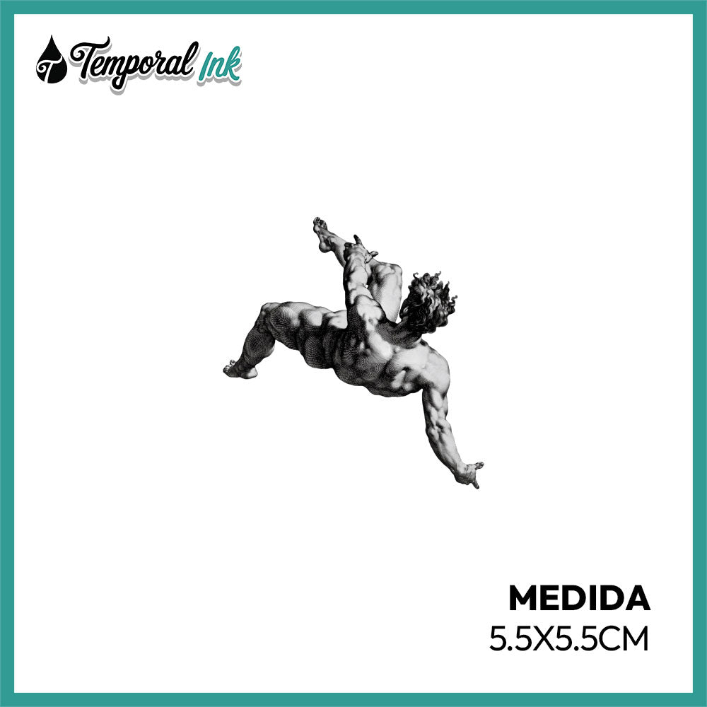 Tatuaje temporal inspirado en escultura clásica en pose dinámica artística.
