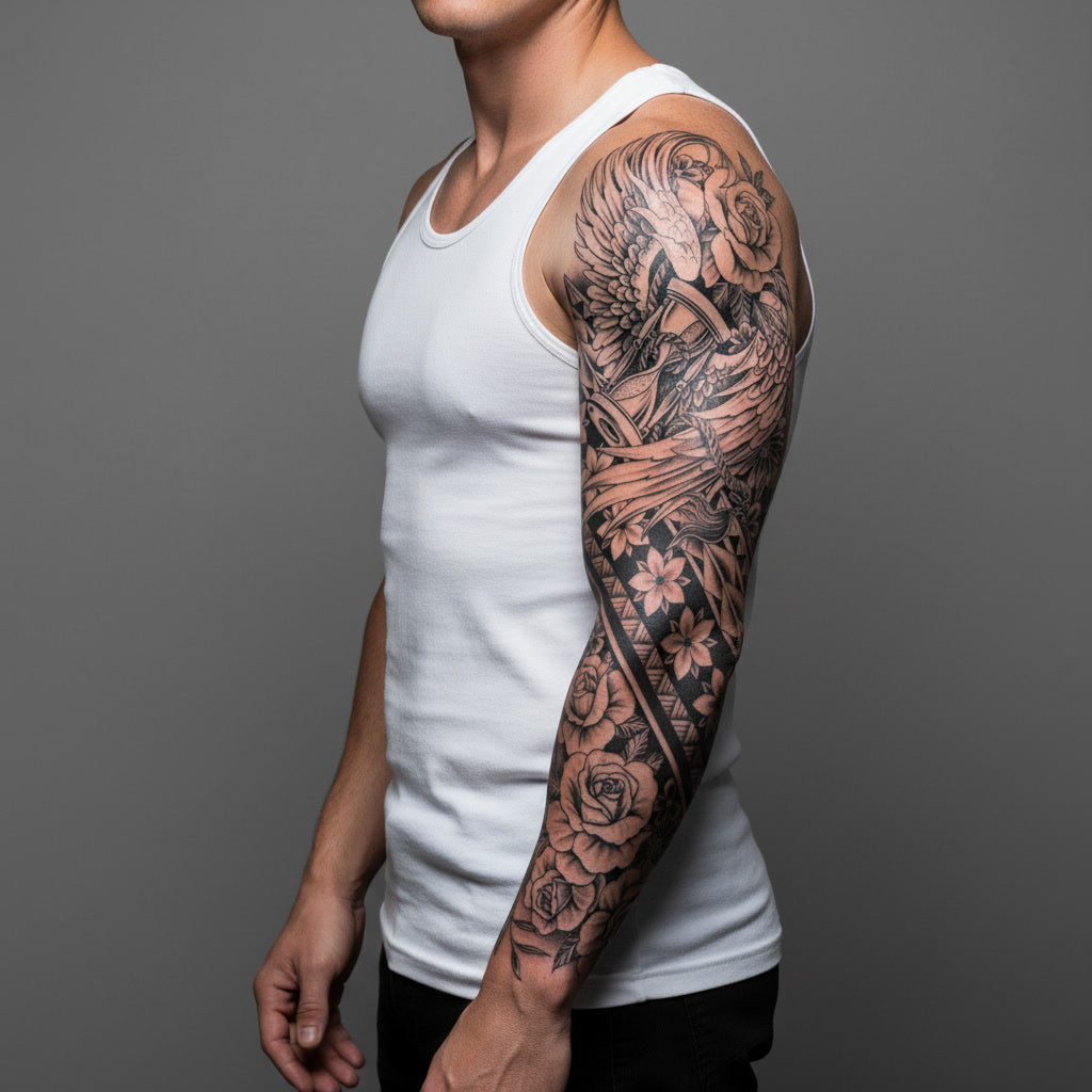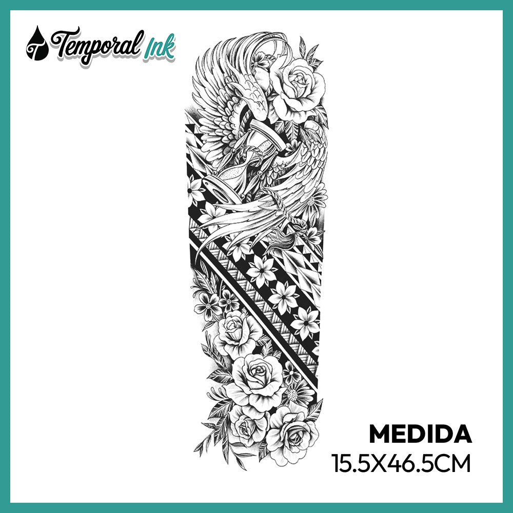 Tatuaje temporal tipo manga con alas, flores y geometría ornamental en blanco y negro, de alto impacto visual.