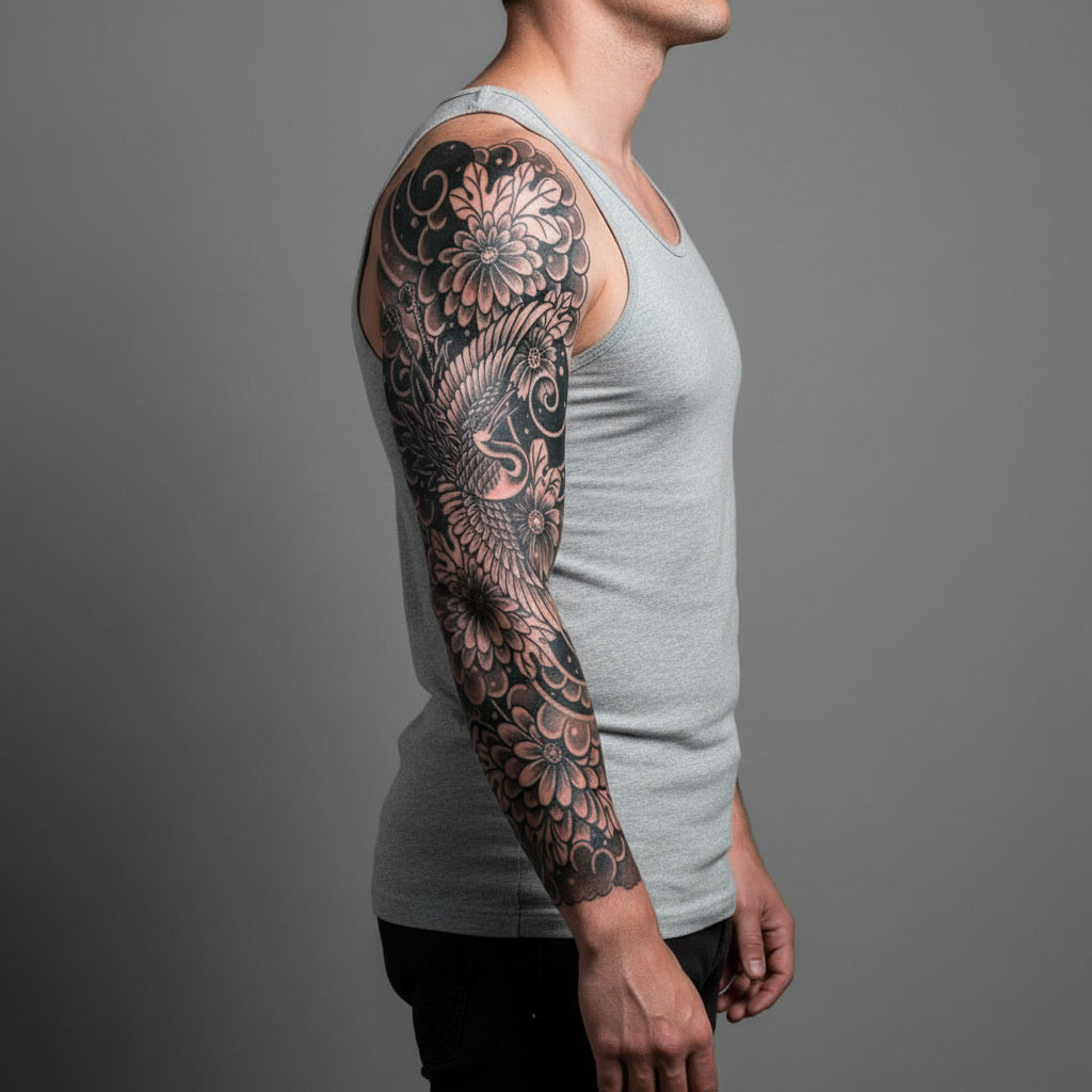 Tatuaje temporal tipo manga con ave y flores ornamentales en estilo ilustrativo, ideal para un look elegante y artístico.