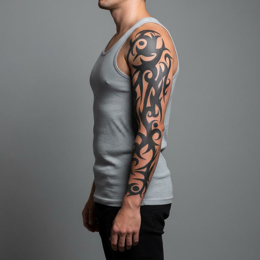 Tatuaje temporal tipo manga con diseño tribal abstracto, líneas negras sólidas y estética contemporánea.