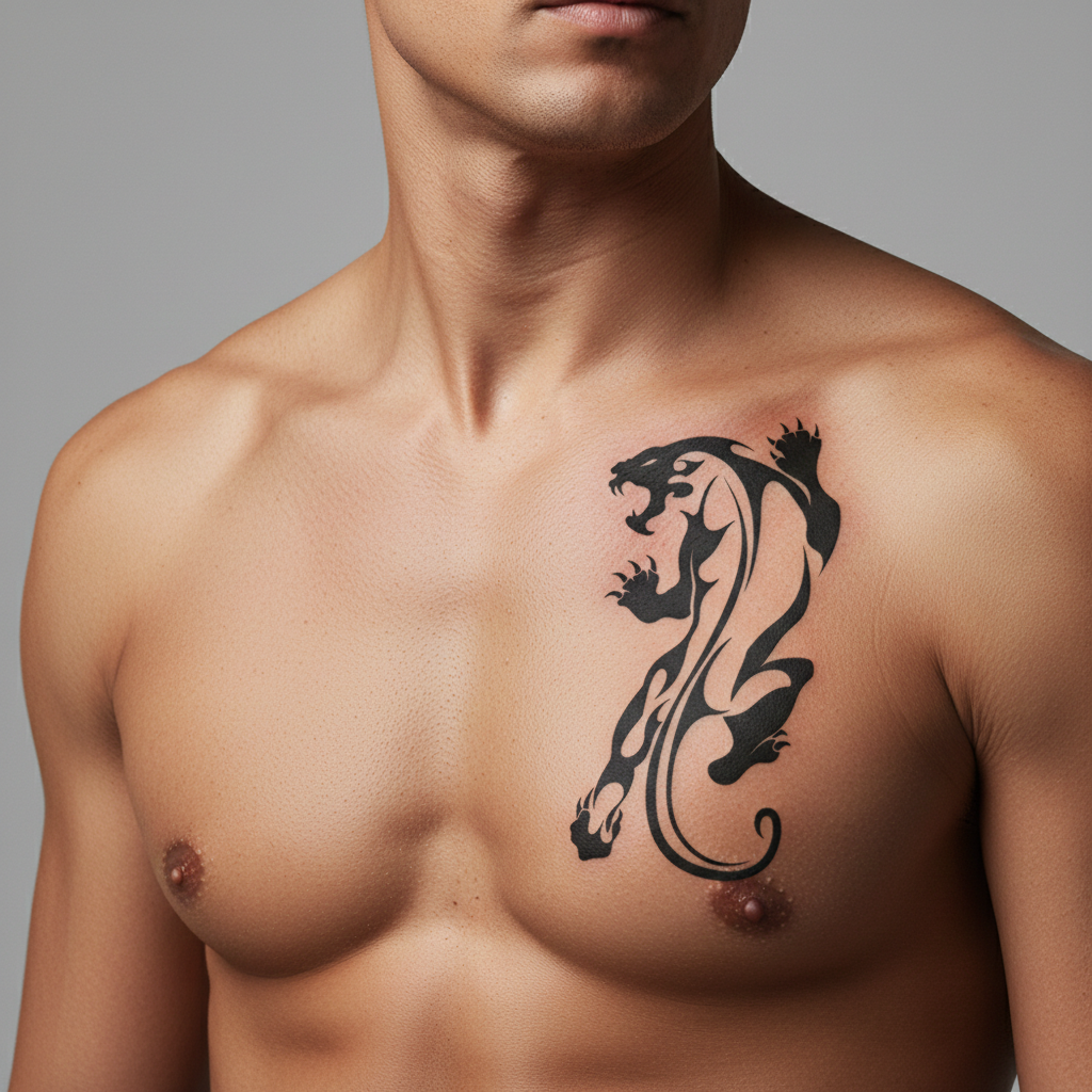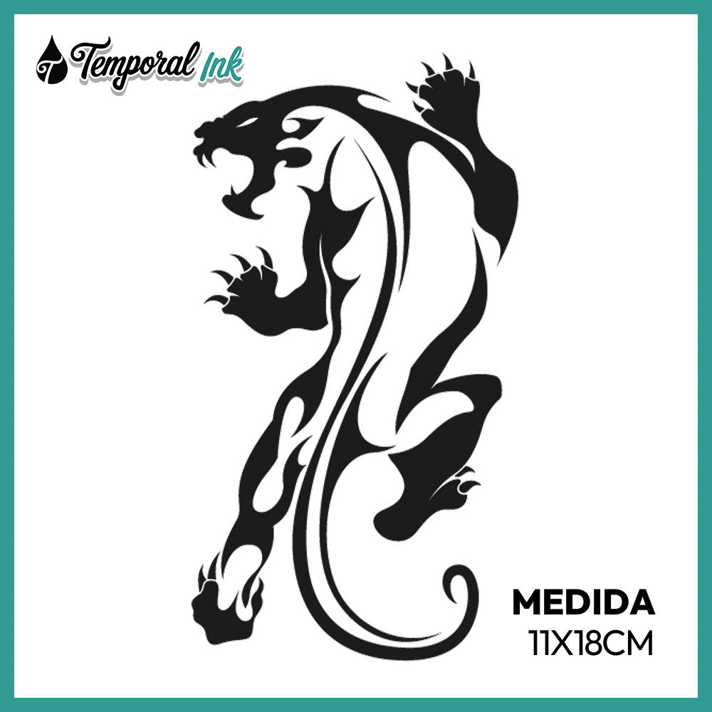 Tatuaje temporal de pantera tribal en tinta negra, fuerte y expresivo.